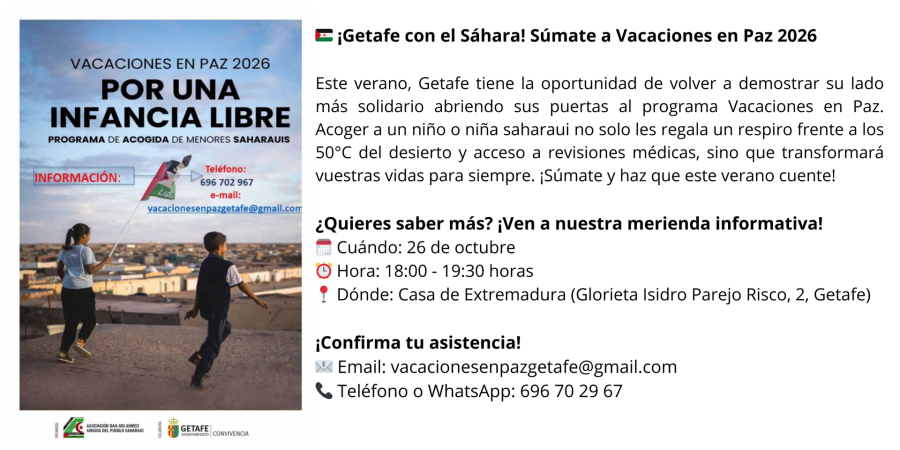 Si este verano quieres ser familia de acogida, escríbenos a vacacionesenpazgetafe@gmail.com